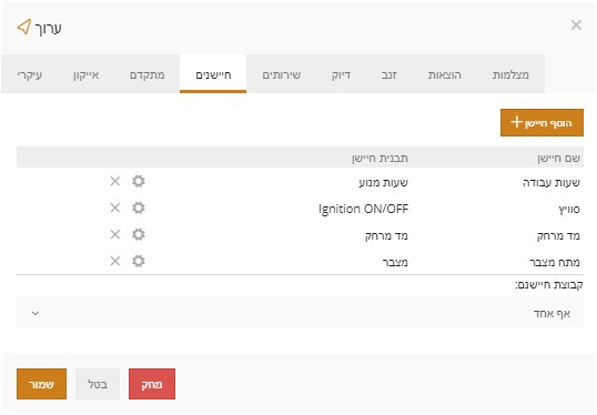 בלשונית חיישנים יש לחוץ על הכפתור העליון “הוסף חיישן”, לחיצה על כפתור זה תגרום לפתיחת כרטסת הגדרות החיישנים.